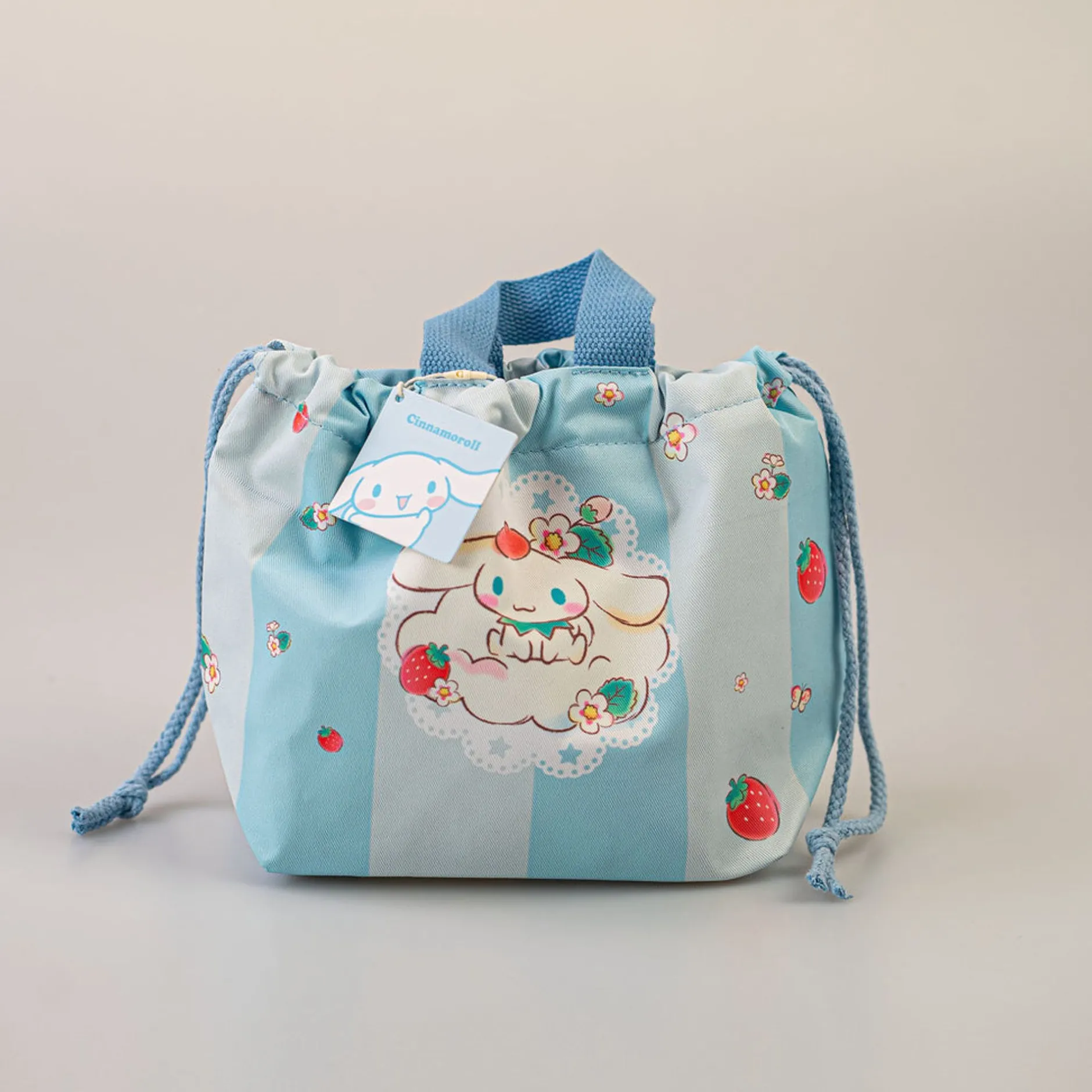 La Borsa Presenta Una Chiusura A Sacco, E Fantasia A Strisce Azzurre Con Immagine Di Cinnamoroll.